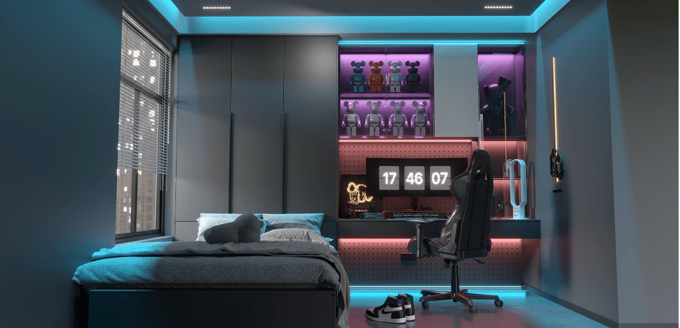 The ceiling and corner lighting create dramatic visual effects. They can make rooms feel larger, add dimension, and provide unique ambient lighting. This cool LED room design approach allows for creative expression.