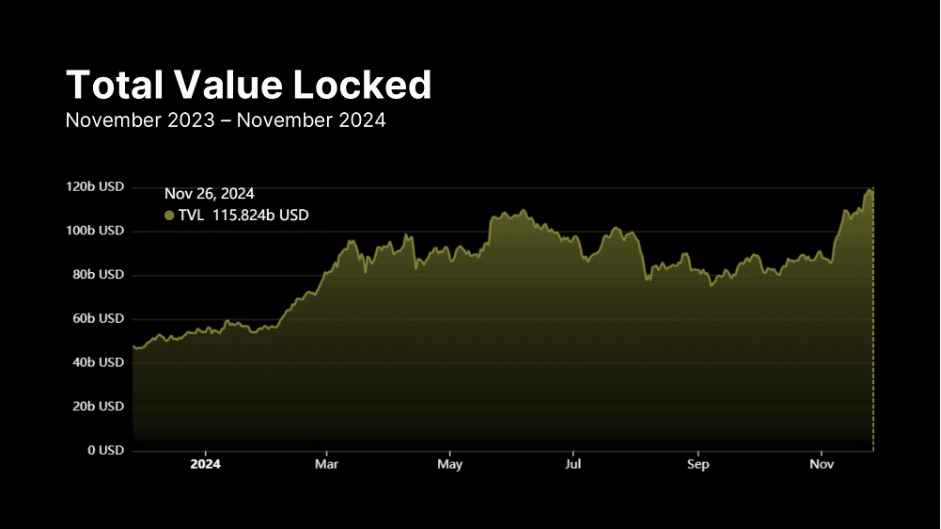 The total value locked across all networks exceeds $115 billion, and a large part of this is in DeFi protocols. Source: DeFiLama