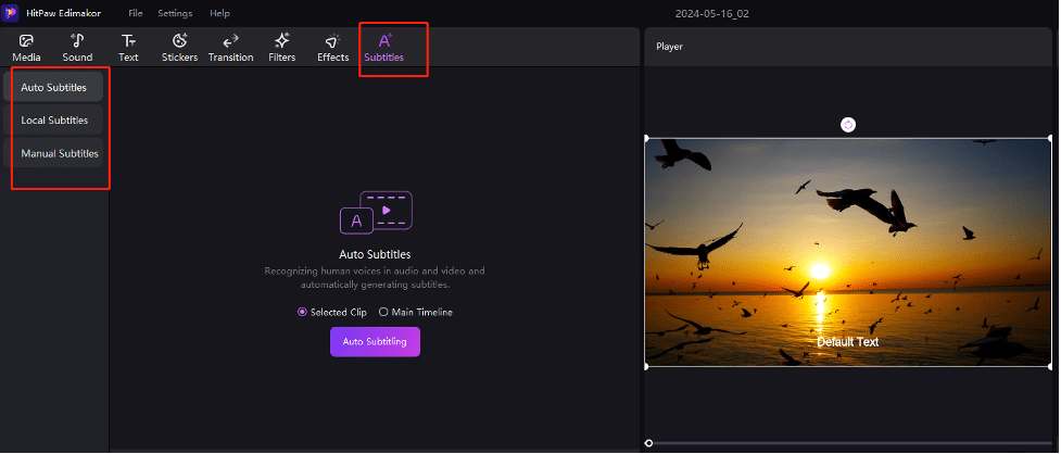Besides Auto Subtitles, you can also choose Local Subtitles or Manual Subtitles. The Local Subtitles option allows you to import caption files in SRT, LRC, ASS, and ATT formats. Alternatively, you can add Manual Subtitles line-by-line to the video.