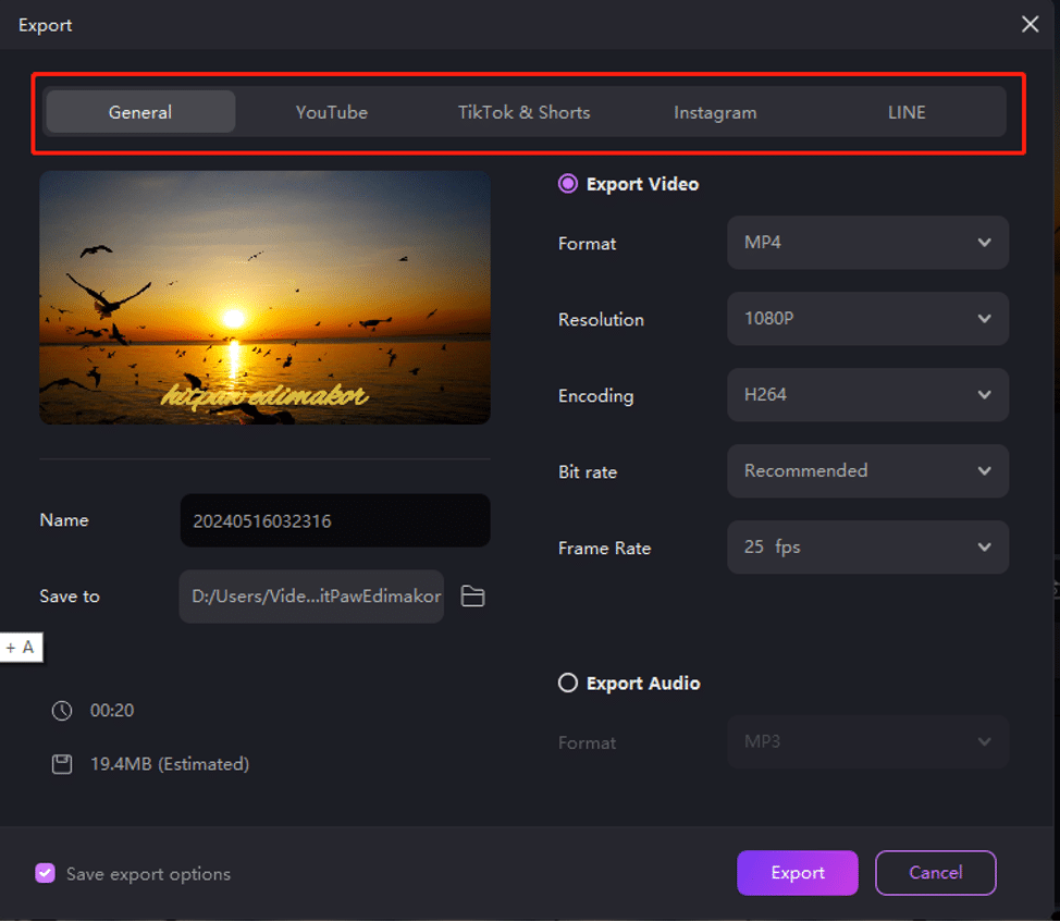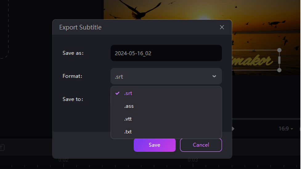 - At long last, when all settings are finished, click on the “Export” button at the top menu bar and pick your preferred settings to save the video with subtitles.