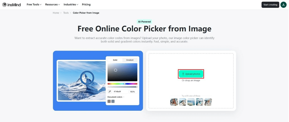 To initiate the process of selecting a color code from an image of your choice, navigate the Color Picker from Image tool on insMind’s official website. Next, click on “Upload photos” to import the image from which you want to pick a color.
