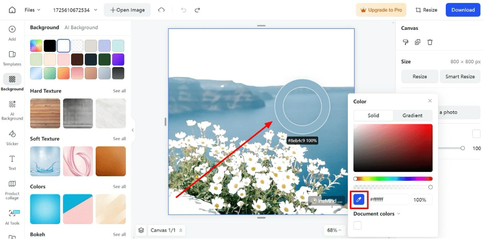 Upon uploading the image, you are redirected to the editing panel of insMind, which automatically removes your background. Within the custom Color pop-up menu, click on the “Picker” icon and drag it across the image to select the color that best matches your theme.