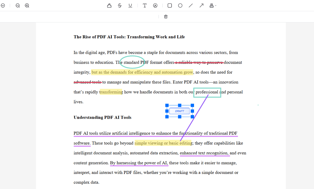● Text and Image Editing: Users can add, modify, or delete text, images, links, and shapes. The tool also allows for adjustments in text properties such as font, size, style, and color.