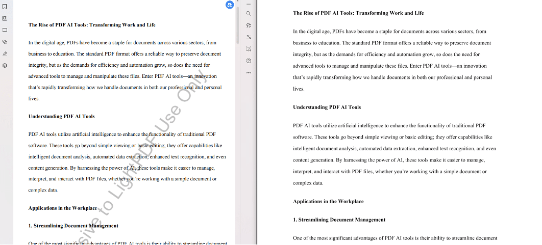 LightPDF stands out as a robust, AI-driven tool for managing PDFs. Its range of features—from watermark removal and content redaction to advanced editing and translation—provides a comprehensive solution for document handling. The tool’s performance in real-world applications, such as processing large files and handling diverse document types, makes it a valuable asset for users seeking efficiency and reliability in PDF management.