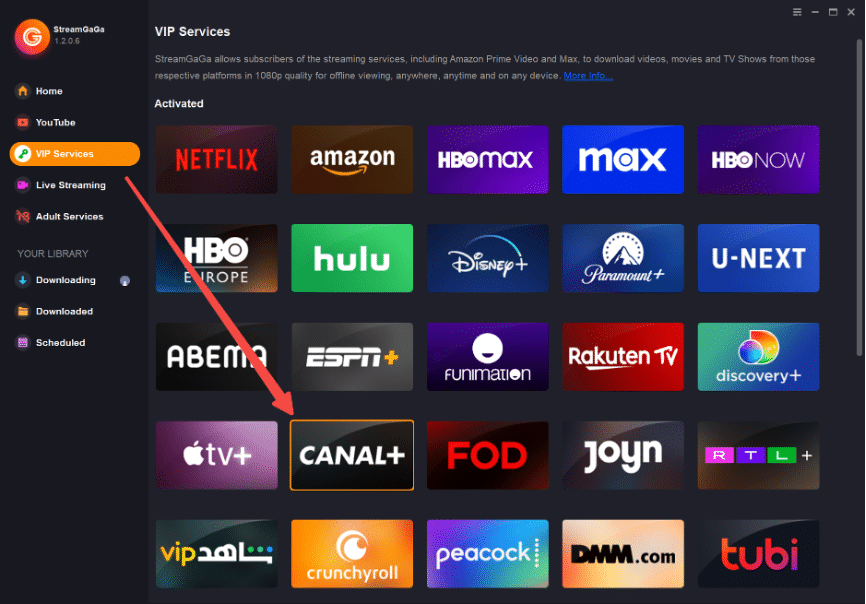 Open StreamGaGa and navigate to the “VIP Services” section. Look for “CANAL+” and select it.