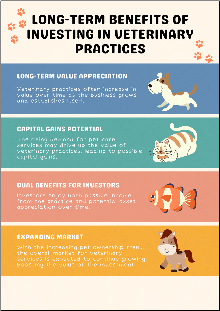 Investments in veterinary practices also hold a good prospect for long-term appreciation in value. The value of veterinary practices tends to be appreciated with the growth and establishment of veterinary practice businesses. Thus, that’s a good avenue for possible future capital gains. Moreover, the increase in pet ownership and high-end pet care services might also drive up the value of veterinary practices in the future.