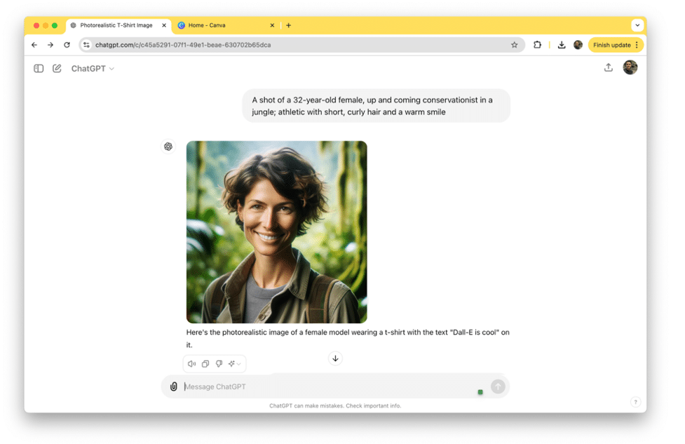 Prompt: A photorealistic image of a female model wearing a tshirt with text “Dall-E is cool” on it.